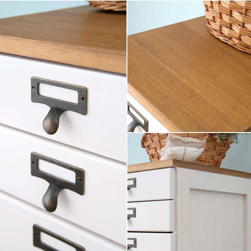 ・木目調の引き出しにアンティーク風金具が付いたおしゃれなチェスト
