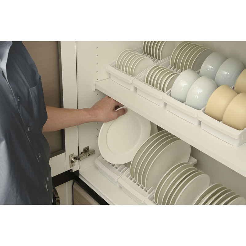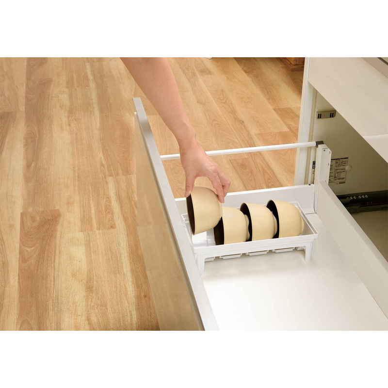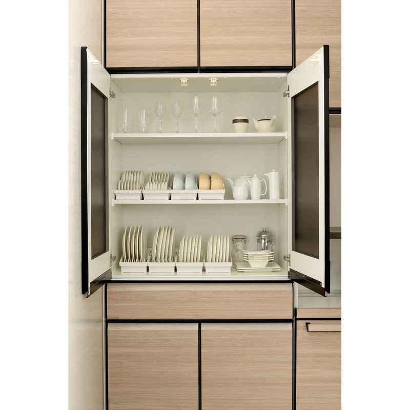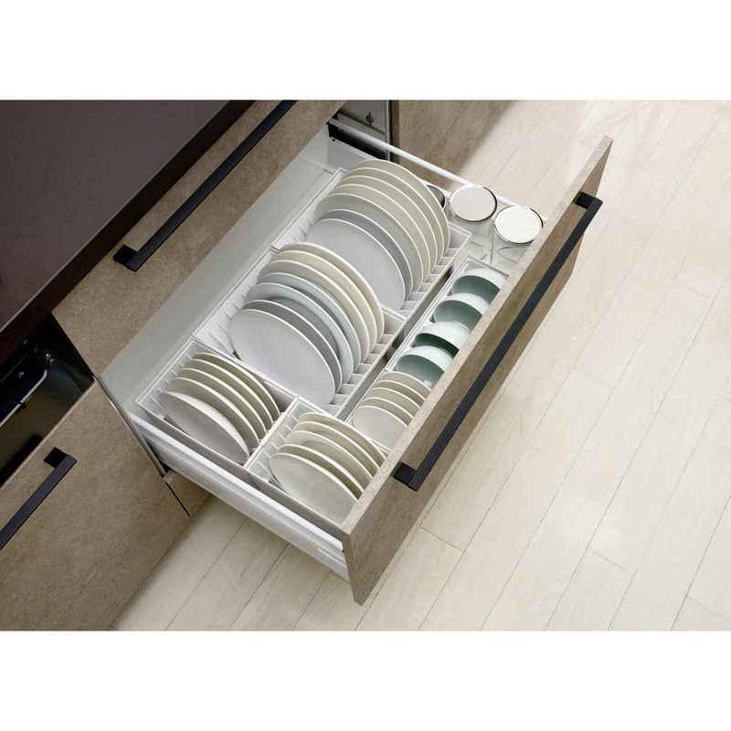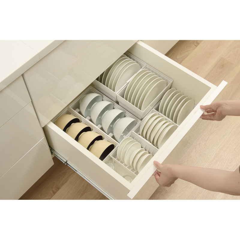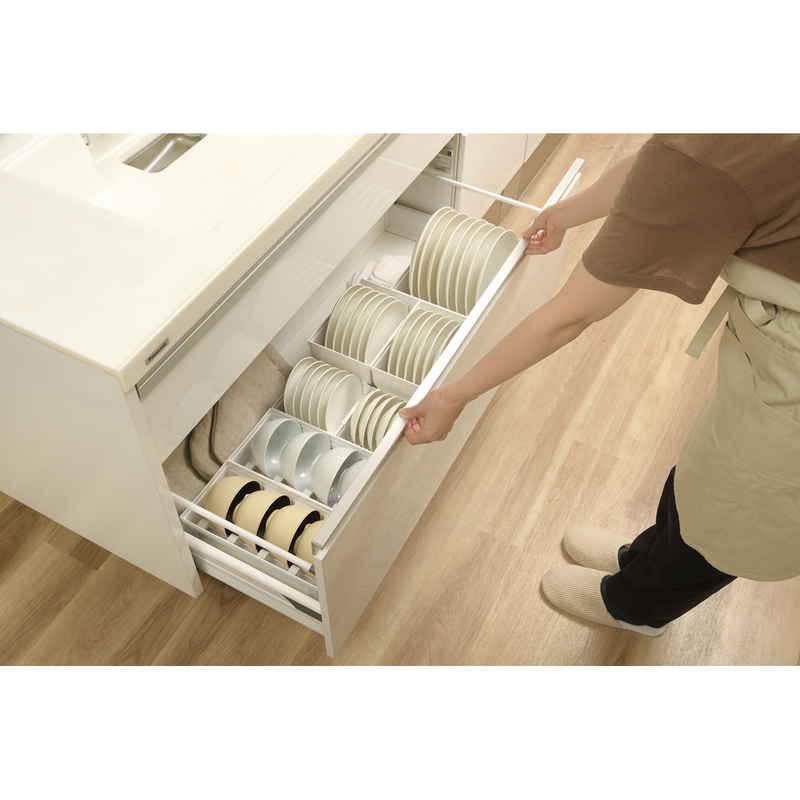 キッチンの引き出しの中をサイズ別に分けて、様々な食器の定位置を作り美しく収納できます。