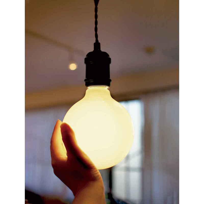 暮らしに寄り添うシンプルな照明 大きめフォルムの電球 高照度で経済的 マットな質感のソケット 取り付け方法も簡単