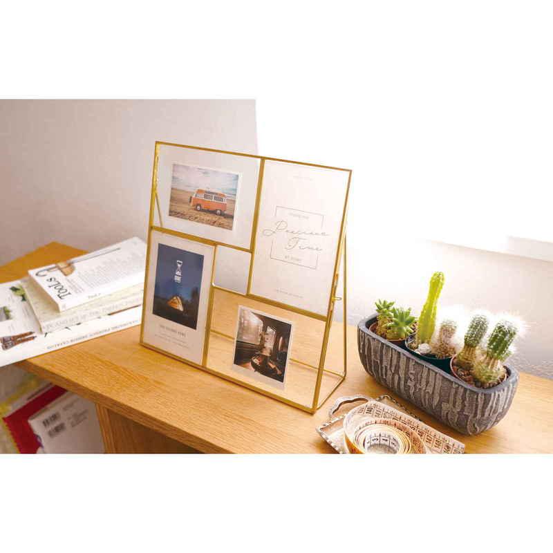 そのまま置くだけでも絵になる、ゴールドカラーの縦2×横2の4つ窓メタルフレームです。