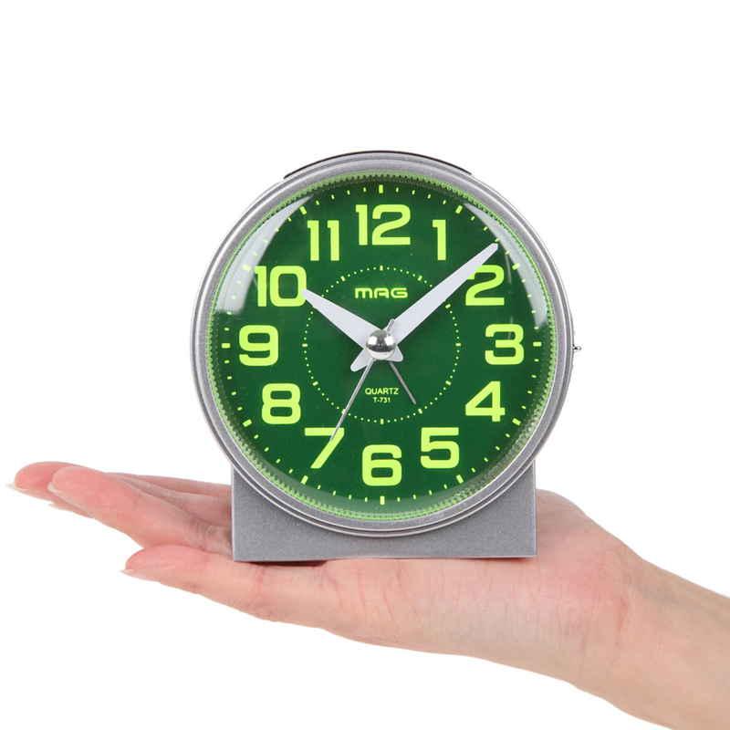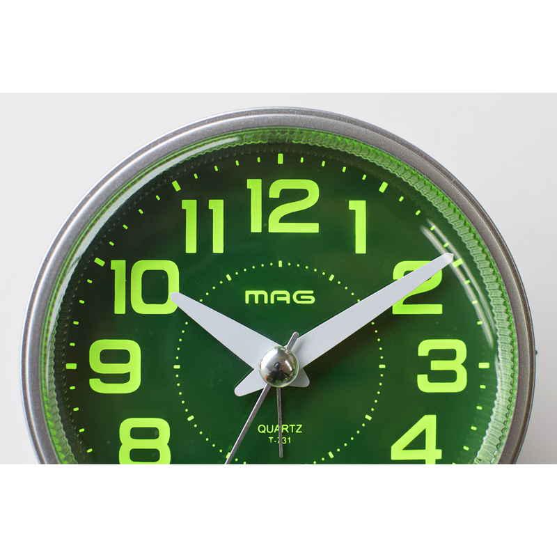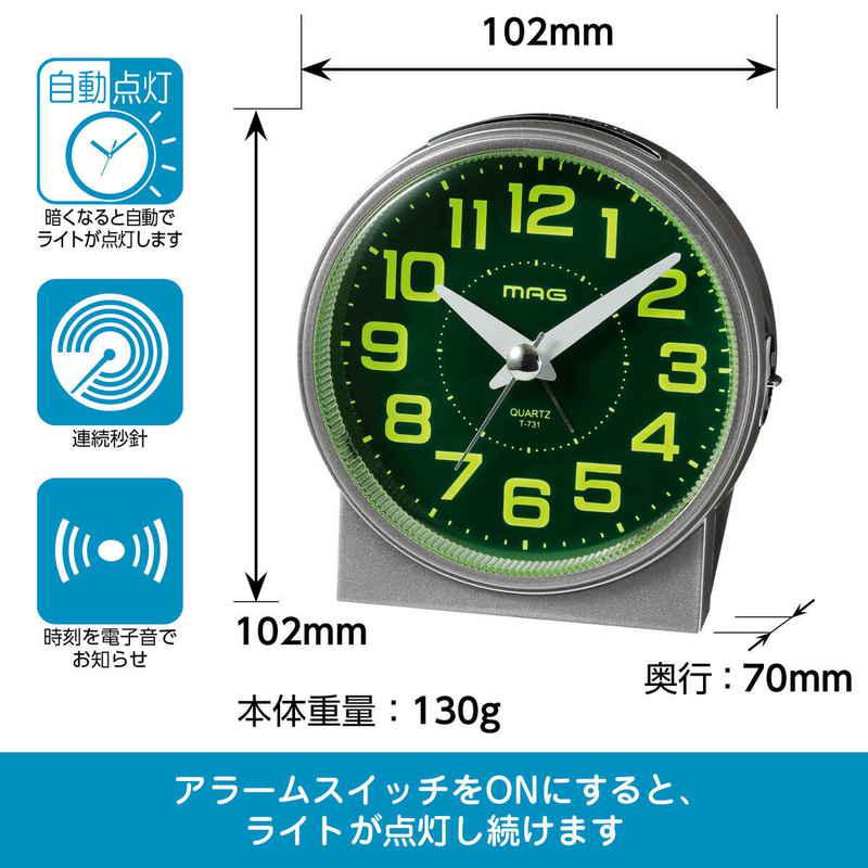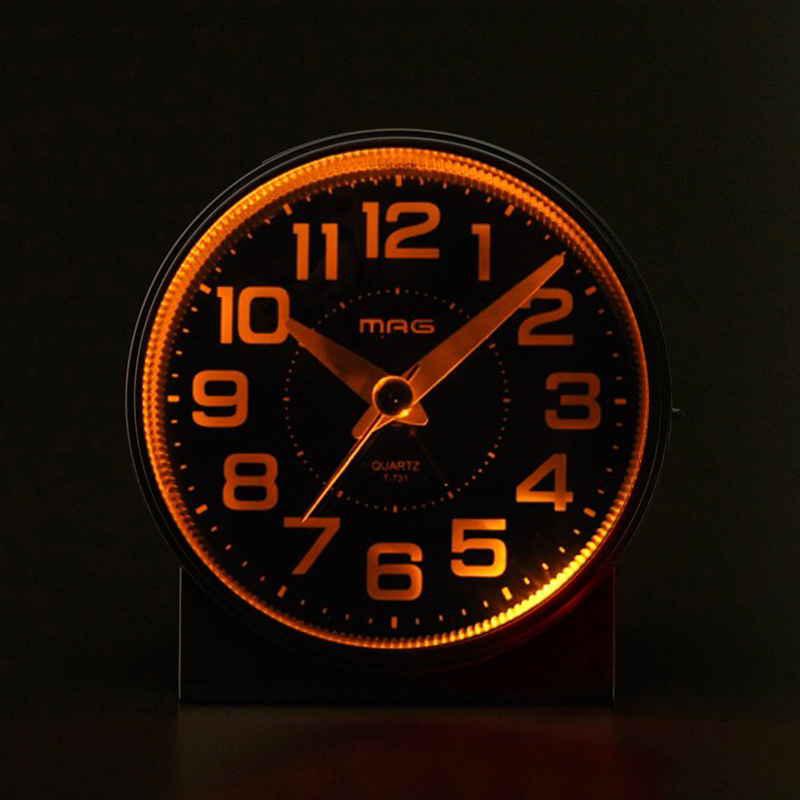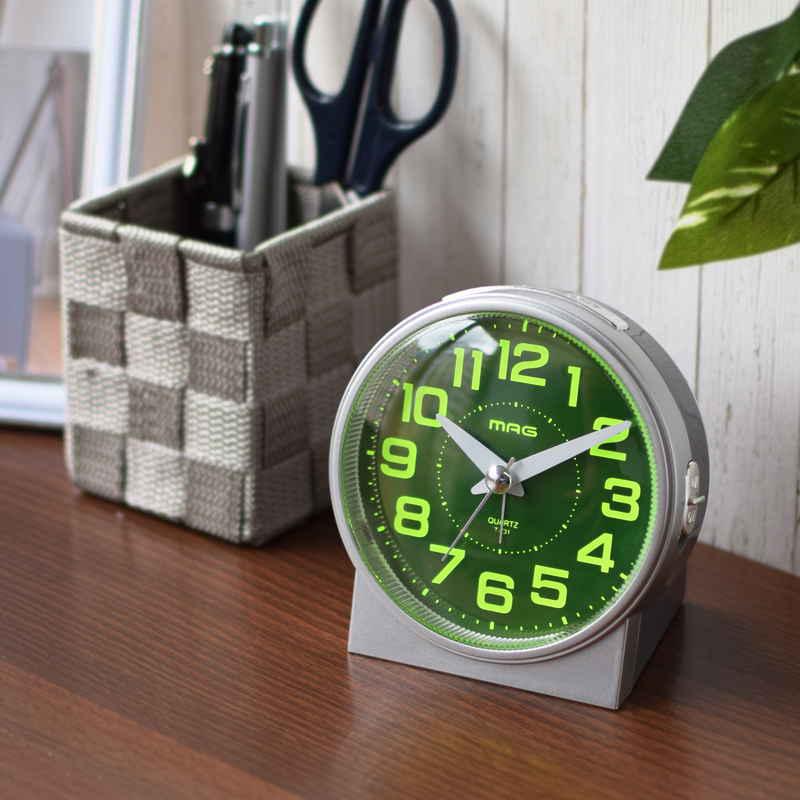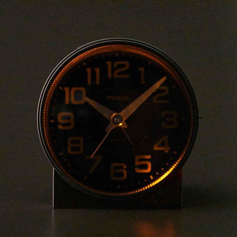 アラームをオンにすると夜間や暗い場所でライトがほのかに点灯し続ける目覚まし時計です。