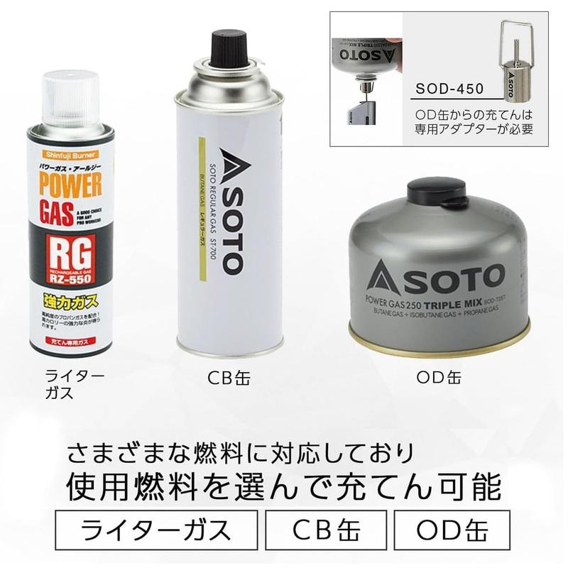 ○使用燃料:ライターガス、CB缶、OD缶(別売フィルアダプター必要)