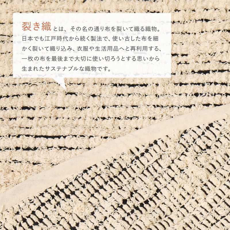 『裂き織』と呼ばれる製法で、製品を作る際に残った生地の切れ端などの端材をアップサイクルした、サステナブルな1枚です