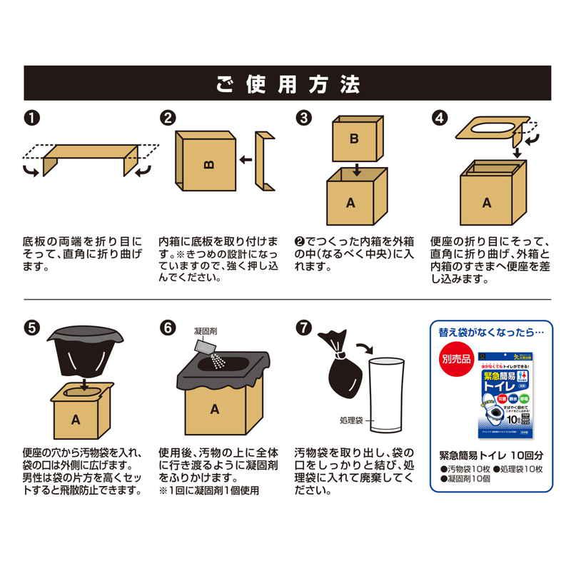 セット内容:1セット 段ボール組立トイレ1個、汚物袋/10枚、処理袋/10枚、凝固剤/10個