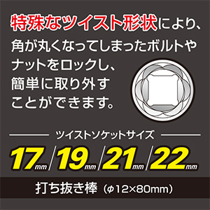 特殊なツイスト形状により、角がまるくなってしまったボルトやナットをロックし、簡単に取り外すことができます。
