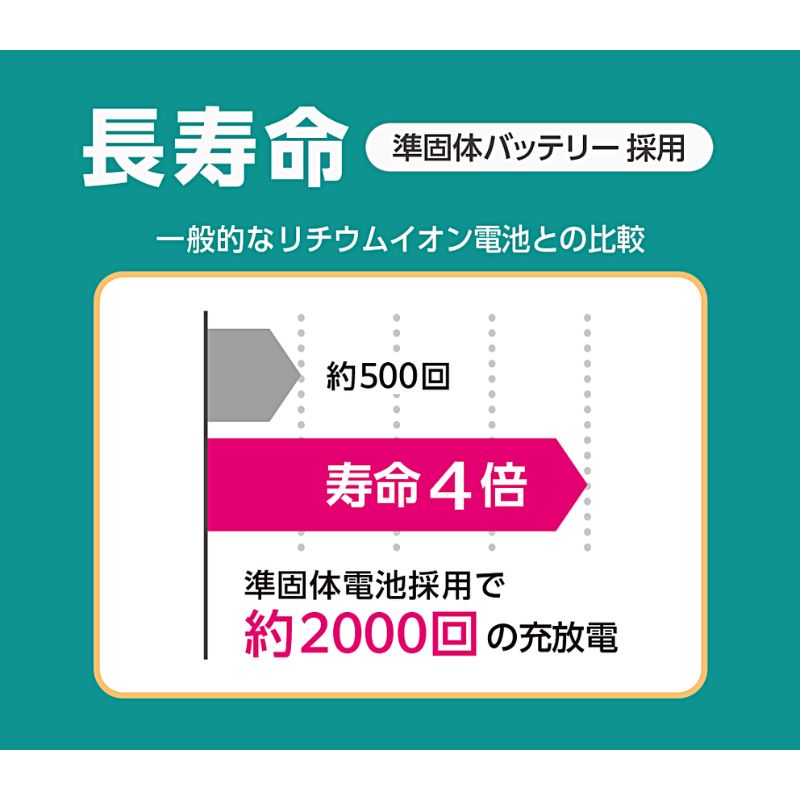 準固体リチウムイオン電池採用で約2000回の充放電に対応