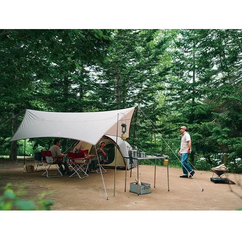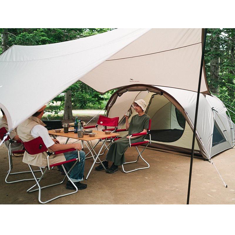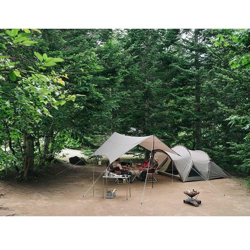 リビングスペース(タープ)は、ランドネストドームとマッチするデザインの風に強いヘキサ型タープです。