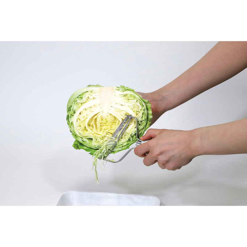 食材に食い込みやすい斜め刃で、ザクザクとキャベツに切り込めます。