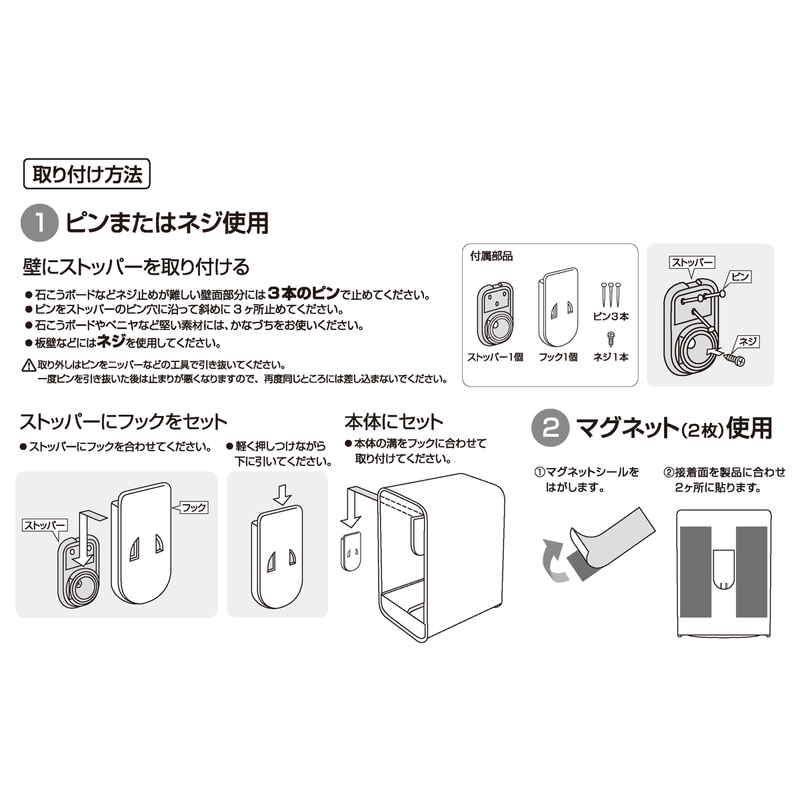 材質:本体/ABS樹脂 フック/ポリプロピレン ストッパー/スチロール樹脂 ネジ/スチール ピン/ステンレス マグネット/異方性フェライトゴム磁石