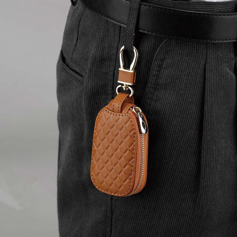 ダイヤ柄の型押しデザインが映えるスマートキーケース。大切な車のキーをキズや汚れから守ります。