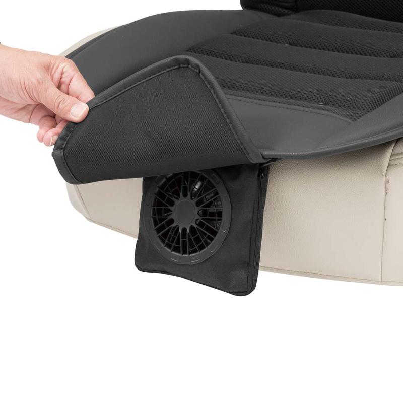 足元についた送風ファンが取り込んだ空気をシートと体の間に送り出し、汗によるムレを解消。