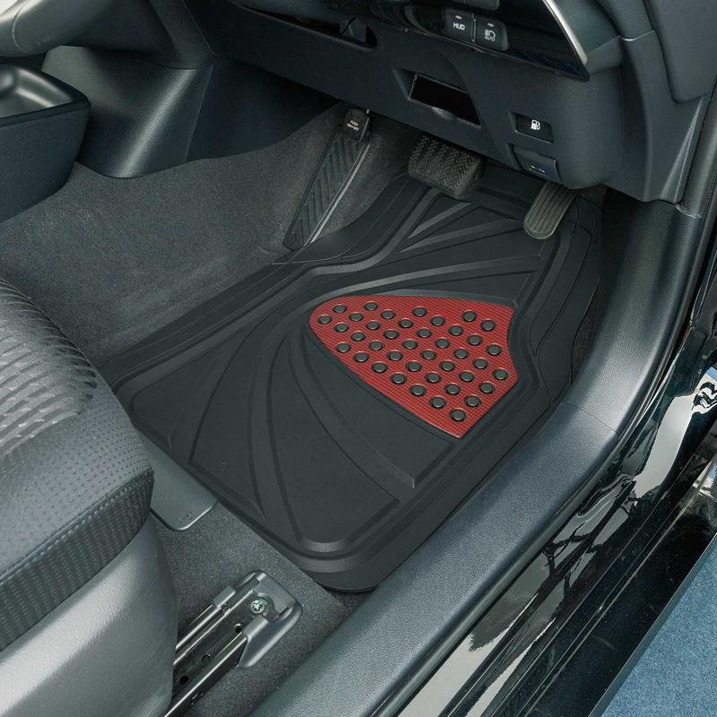 メタル調のヒールパッドが輝くスポーティーなデザインの前席用ラバーマット。