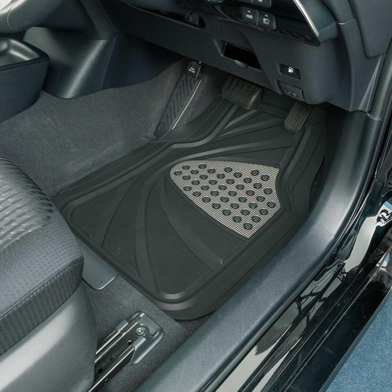 メタル調のヒールパッドが輝くスポーティーなデザインの前席用ラバーマット。