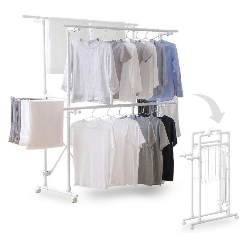 大容量の洗濯物を干すことができ、ワンピースやズボンなどの長物も干せます。