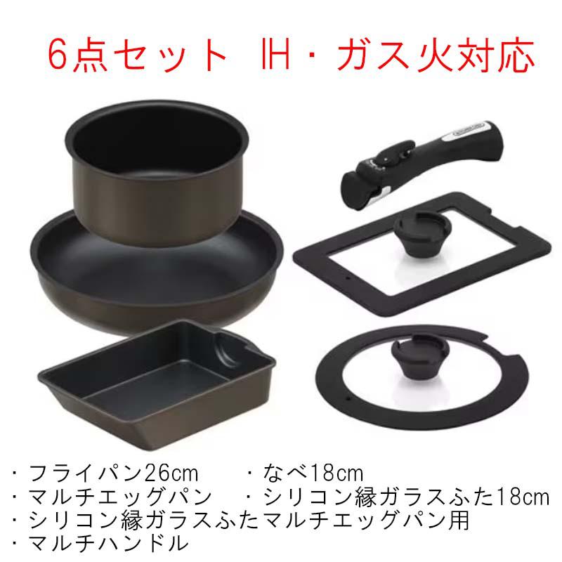 ・セット内容:フライパン26cm、なべ18cm、マルチエッグパン、シリコン縁ガラスふた18cm、シリコン縁ガラスふたマルチエッグパン用、マルチハンドル