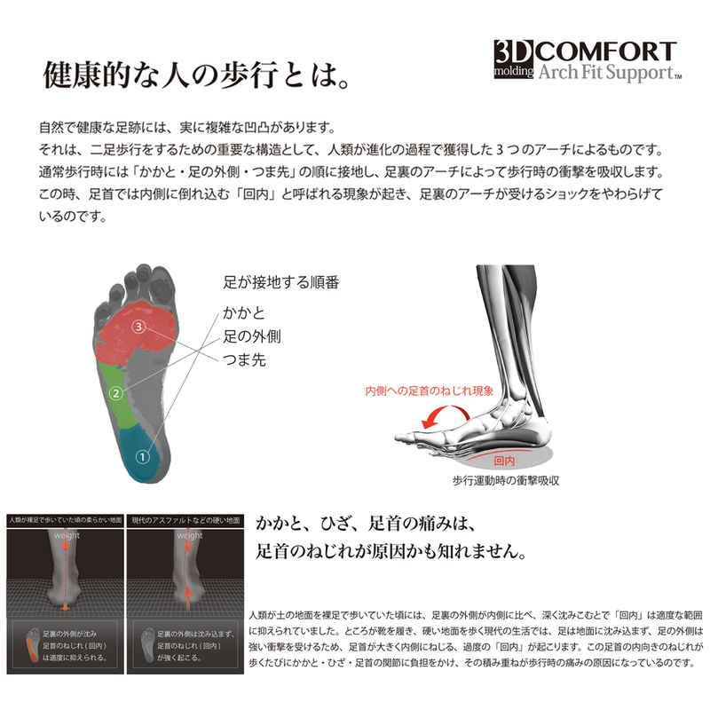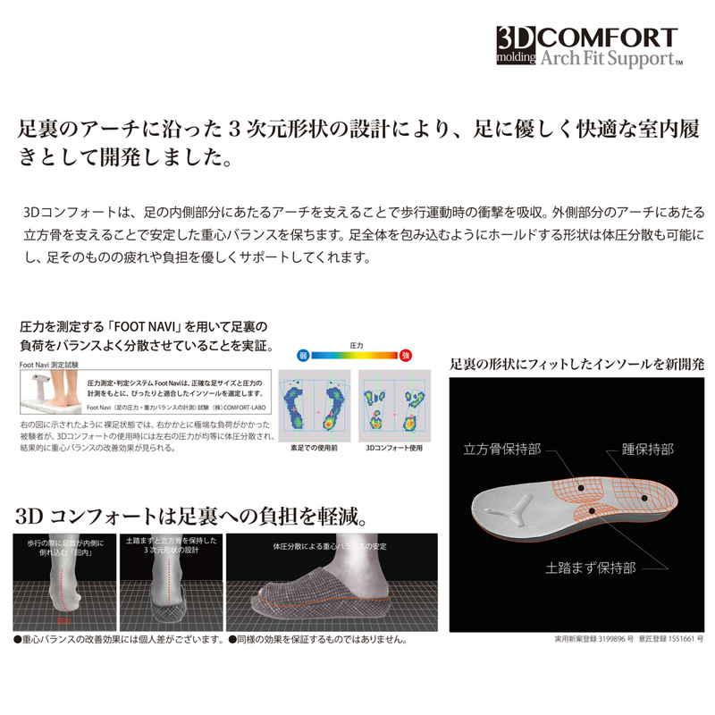 足裏のアーチに沿った3次元形状の設計により、足に優しく快適な室内履きとして開発された3Dコンフォートスリッパです。