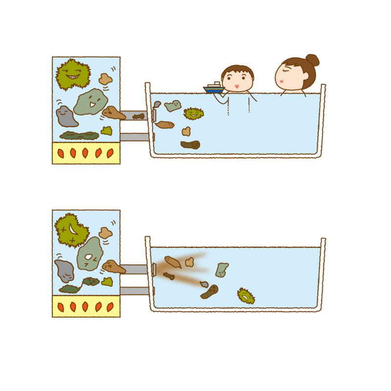 ※古い風呂釜などで本体やパイプのつなぎ目、ゴムパッキン部分にヒビ割れやゆるみなどが生じている場合、そこに湯アカやサビなどが詰まり、一時的に水漏れが止まっていることがあるので、ご注意ください。