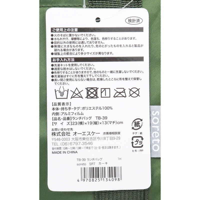 オーエスケー ランチバッグ soreto ウォッシャブルランチバッグ カーキ