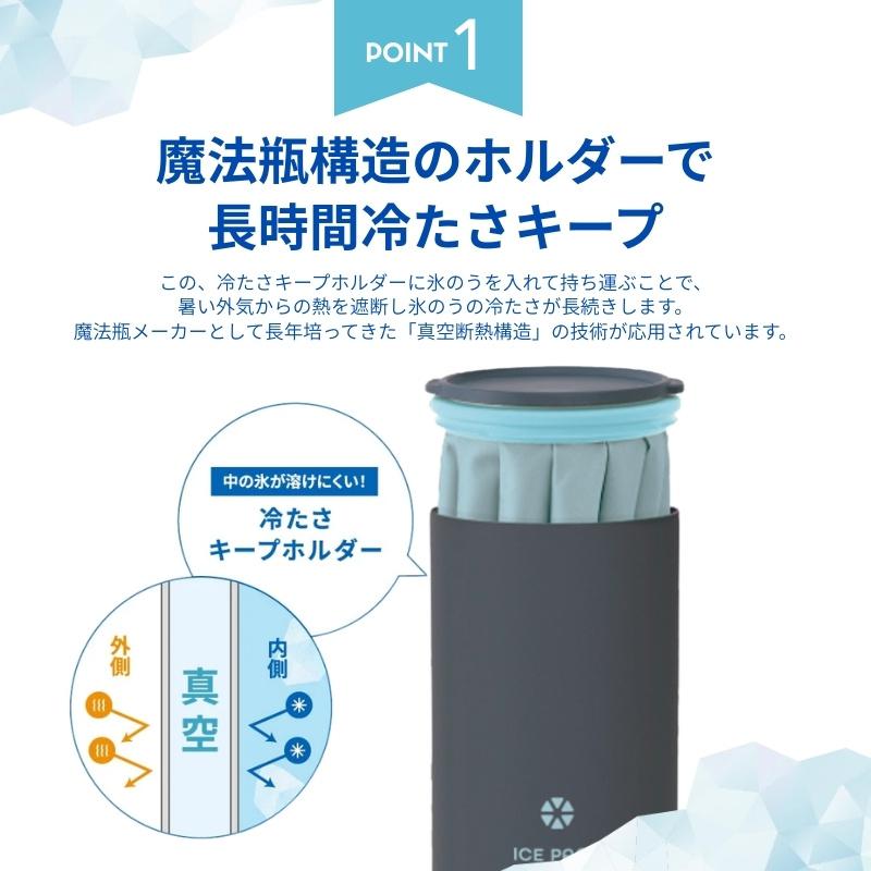 付属の「冷たさキープホルダー」に氷のうを収納することで、外気の熱を真空断熱構造が遮断。炎天下の屋外でも保冷効果が持続します。魔法瓶メーカーならではの技術が、氷のうの常識を変えます。
