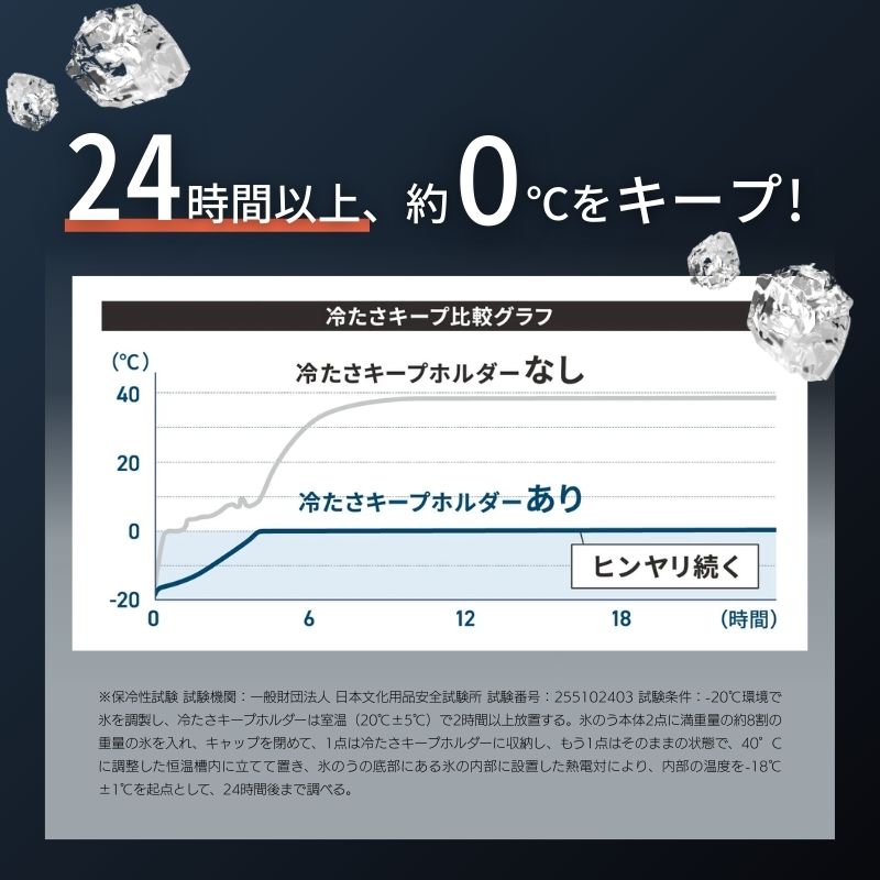 ※保冷性試験 試験機関:一般財団法人 日本文化用品安全試験所 試験番号:255102403 試験条件:-20℃環境で氷を調製し、冷たさキープホルダーは室温(20℃±5℃)で2時間以上放置する。氷のう本体2点に満重量の約8割の重量の氷を入れ、キャップを閉めて、1点は冷たさキープホルダーに収納し、もう1点はそのままの状態で、40℃に調整した恒温槽内に立てて置き、底部にある氷の内部に設置した熱電対により、内部温度を-18℃±1℃を起点として24時間後まで調べる。