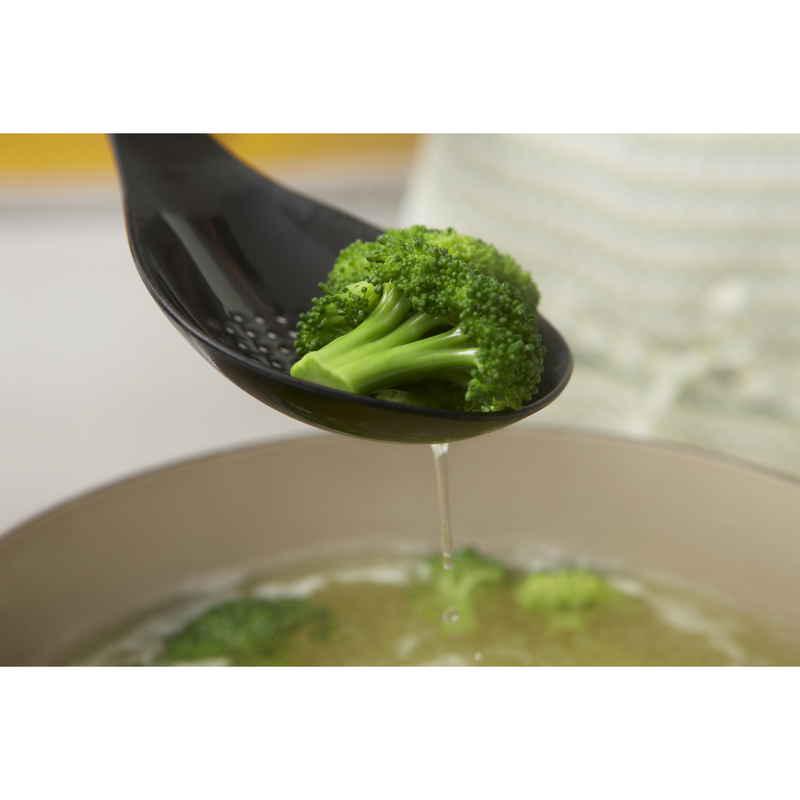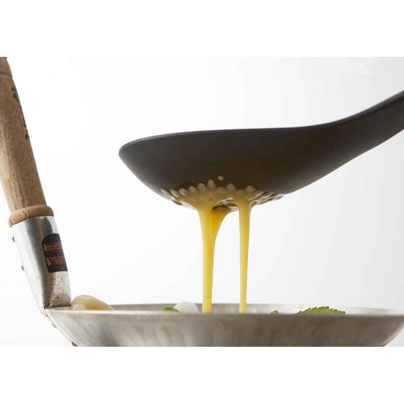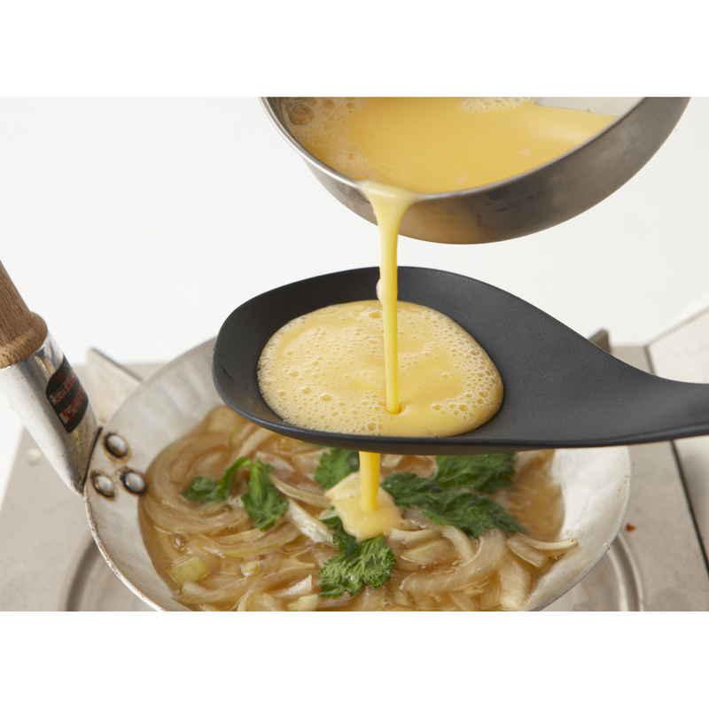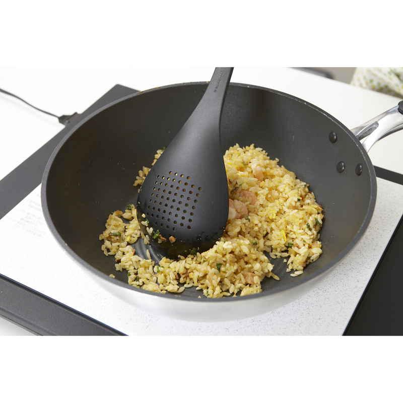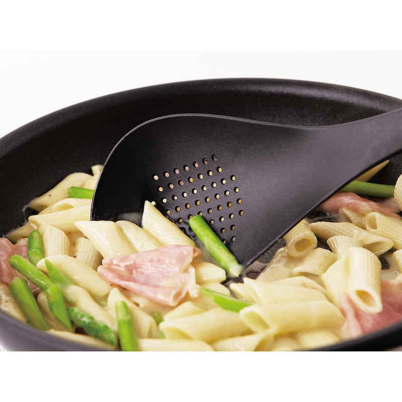 フライパンや鍋を傷つけにくいフッ素樹脂コーティングしたナイロン製のザル型スプーンです。