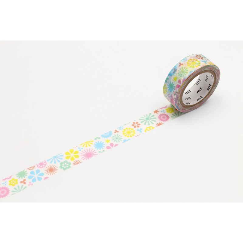 大小さまざまな形の花柄がプリントされたカラフルなテープです。