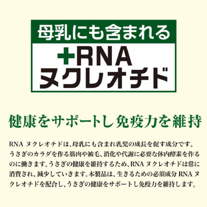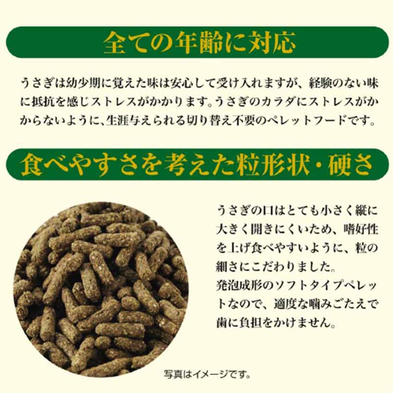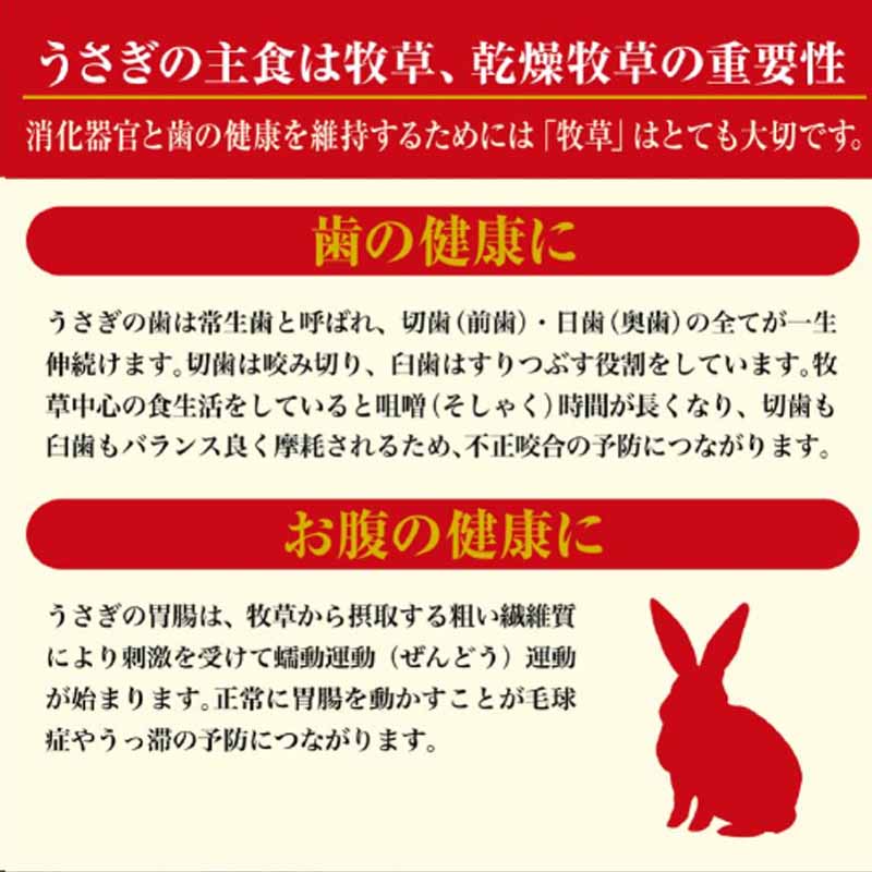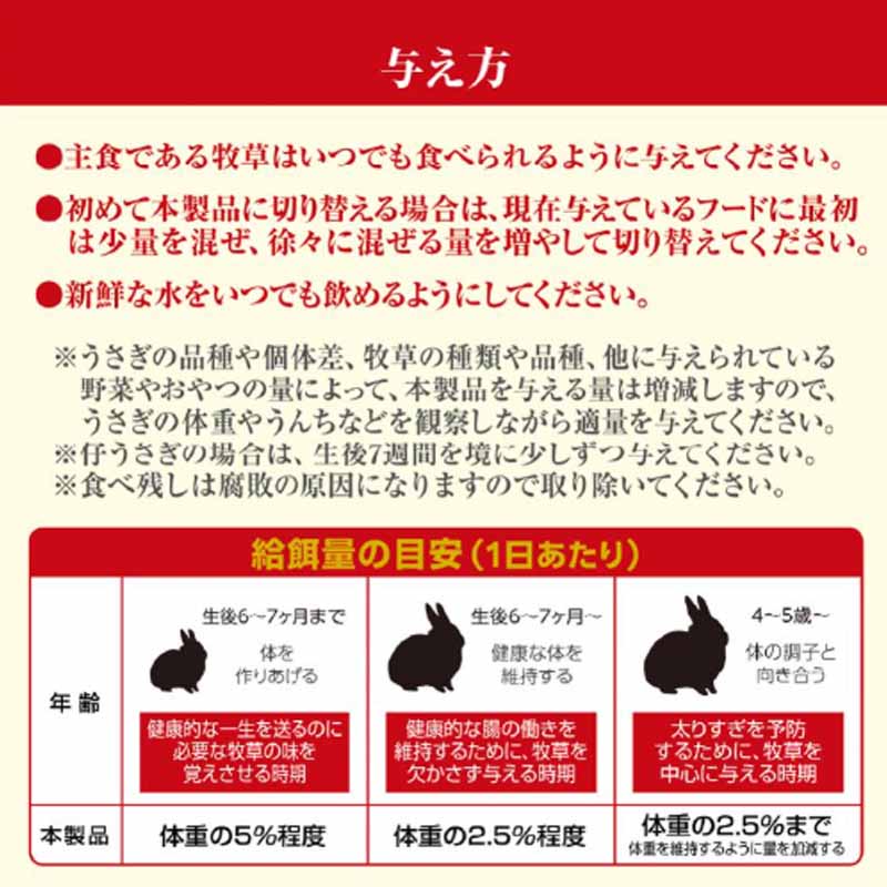 ・主食である牧草はいつでも食べられるように与え、本製品は一日の給餌量を生後6〜7ヶ月までは体重の5%、生後6〜7ヶ月からは体重の2.5%、4〜5歳からは体重の2.5%まで(体重を維持するように量を加減する)を目安に与えてください。