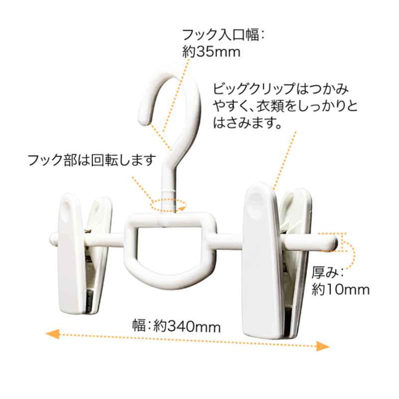 材質:本体、フック/ポリプロピレン クリップ/ハイインパクトスチロール、ポリエチレン バネ/鉄、クロームメッキ
