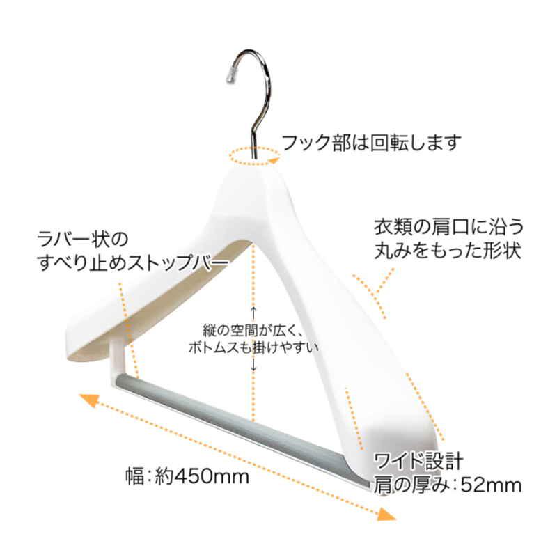 衣類が引き立つスーツハンガー 幅45cm ジャケットの型崩れを防ぐ シンプルが美しい「モノクローゼット」シリーズ ラバー仕様の滑り止めストップバー 衣類の肩に沿う形状