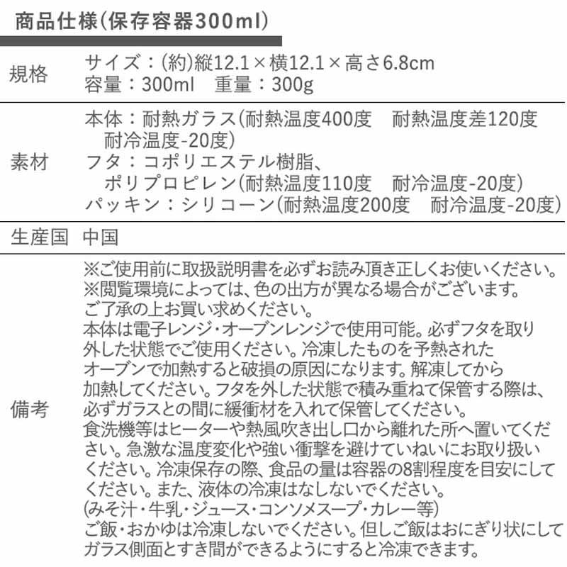 ・材質:[本体]耐熱ガラス(耐熱温度400度、耐熱温度差120度、耐冷温度-20度)、[フタ]コポリエステル樹脂、ポリプロピレン(耐熱温度110度、耐冷温度-20度)、[パッキン]シリコーン(耐熱温度200度、耐冷温度-20度)