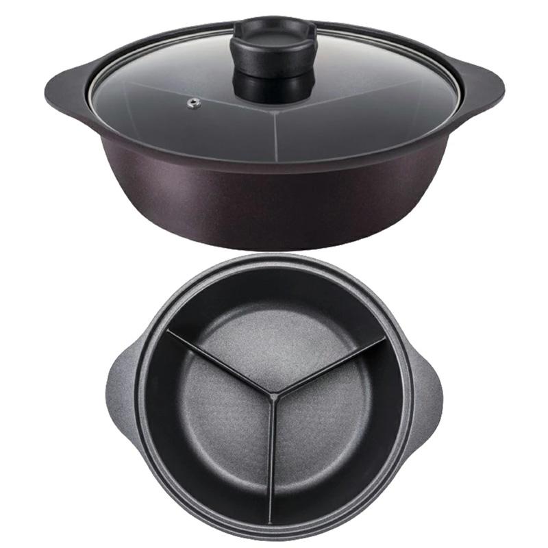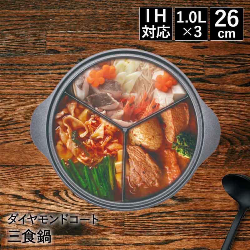 三食鍋 仕切り 仕切り付き 仕切り鍋 IH ガラス蓋 ガラス ふた付き オール熱源 ガス 鍋 黒 ブラック おしゃれ 26cm 大きい 大 卓上 二人用 4L こげつかない お手入れ簡単 洗いやすい