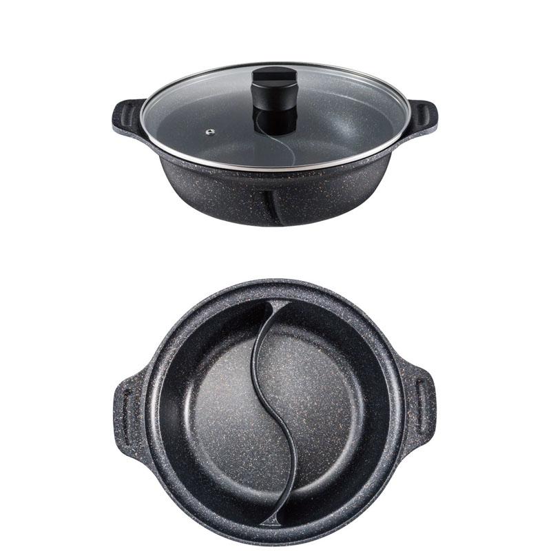二食鍋 仕切り 仕切り付き 仕切り鍋 IH ガラス蓋 ガラス ふた付き オール熱源 ガス 鍋 黒 ブラック おしゃれ 26cm 大きい 大 卓上 二人用 4L こげつかない お手入れ簡単 洗いやすい