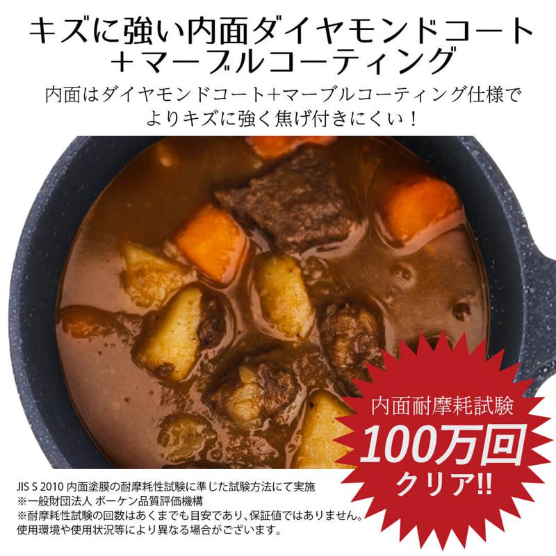 ・内面はふっ素樹脂塗膜加工+ダイヤモンドコート+マーブルコート。外面はふっ素樹脂塗膜加工+マーブルコート