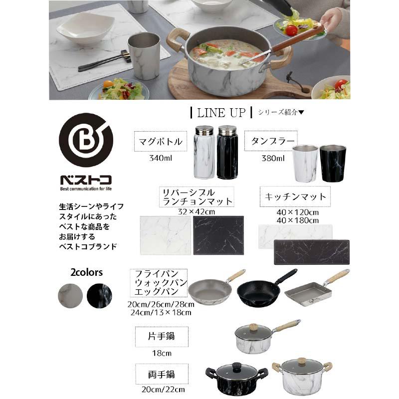 ・フライパン、鍋、タンブラー、ボトル、ランチョンマット、キッチンマットでトータルコーディネートが可能