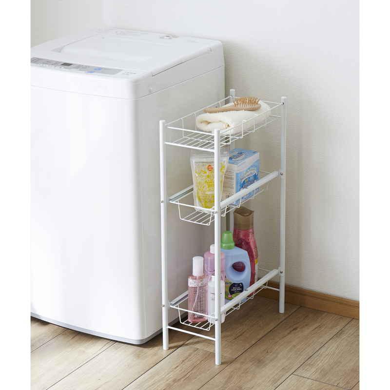 洗濯機横のスペースを有効活用 小物を置くのにぴったりな上段 下2段は引き出し式で取り出しやすい 引き出しはストッパー付きで抜け落ちない 様々な場所で使える