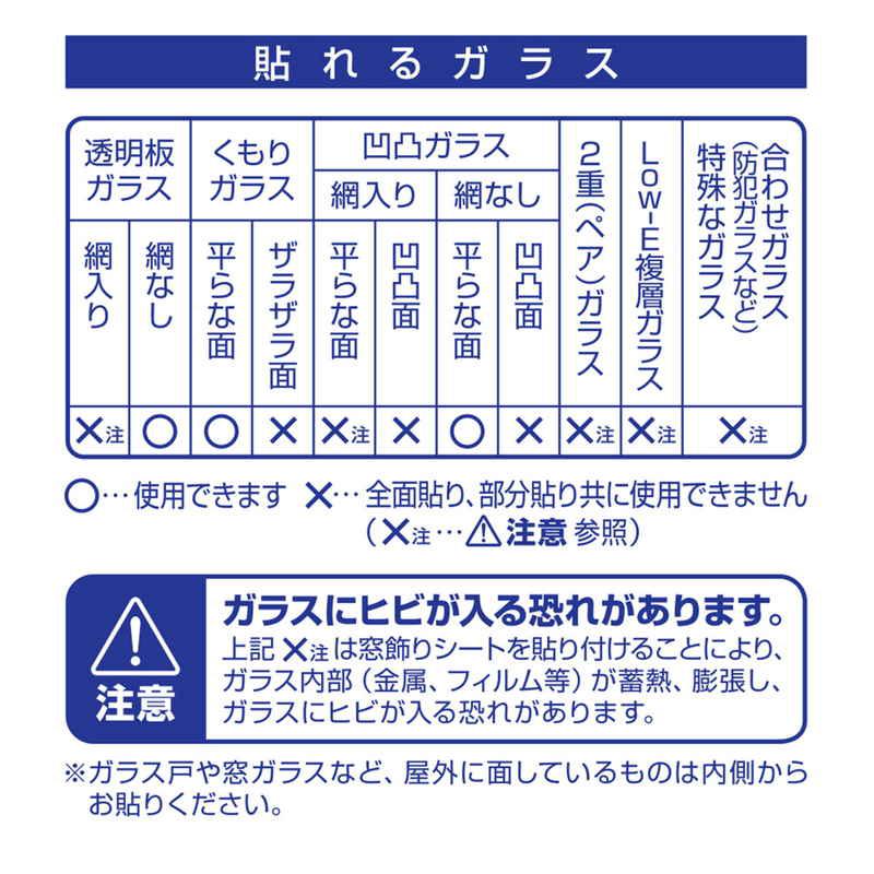 注意事項:使用できるところ 透明板ガラス、くもりガラスの平らな面、凹凸ガラスの平らな面 ※凹凸面には貼り付きません 使用できないところ 網入りガラス、2重ガラス、複層ガラス、合わせガラス(防犯ガラスなど)特殊なガラス ※ガラスの種類によっては、ガラス内部(フィルム等)が蓄熱・膨張し、ヒビが入る恐れがあります ※ガラス戸や窓ガラスなど、屋外に面しているものは内側からお貼りください
