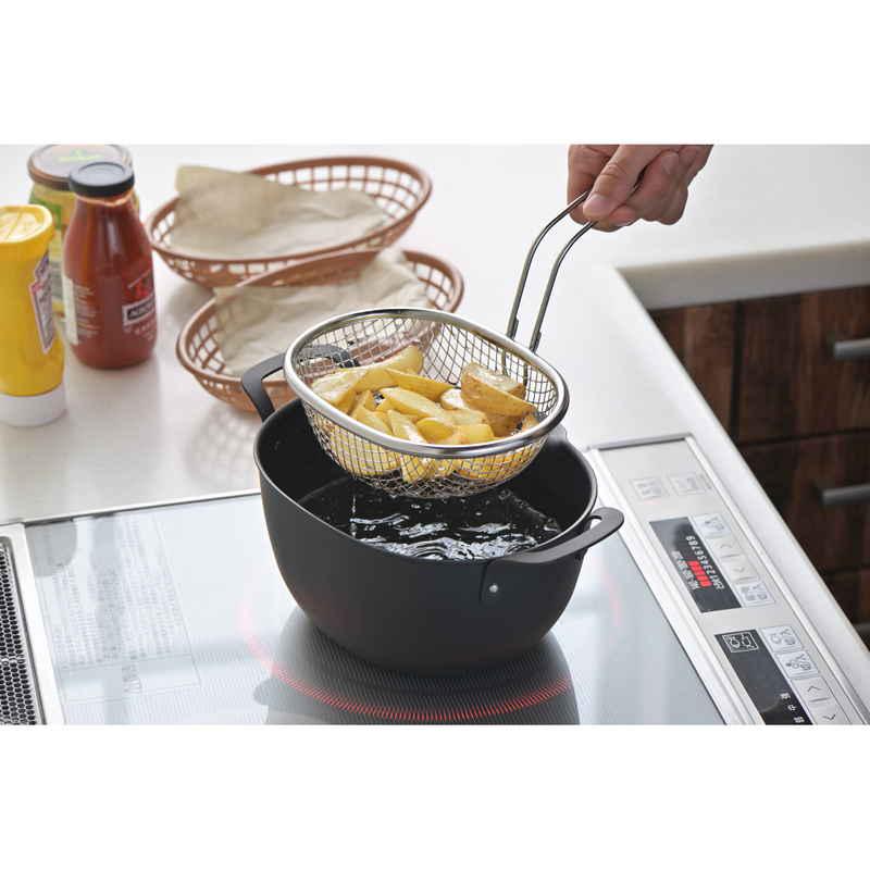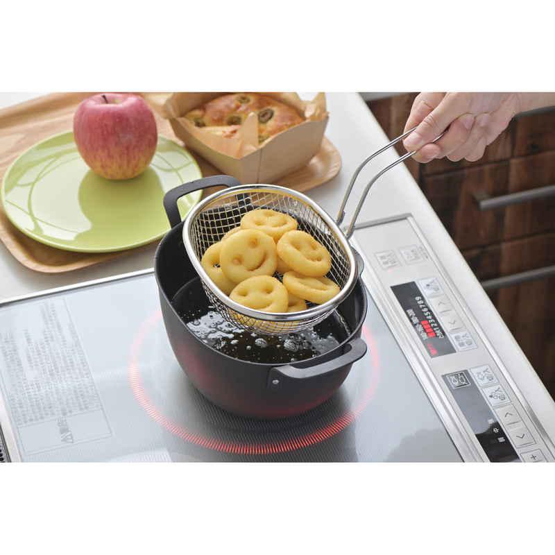 長めのハンドルで、揚げ物をすくう時も手が熱くなりにくく、安心してお使いいただけます。