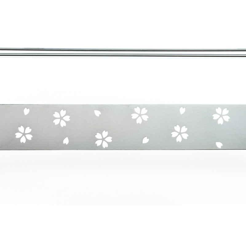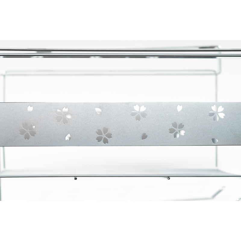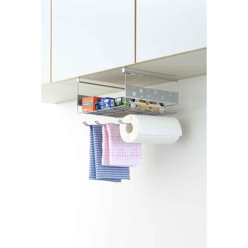 戸棚下を有効活用できる、両サイドに華やかな桜模様が施された吊り戸棚下ラックです。