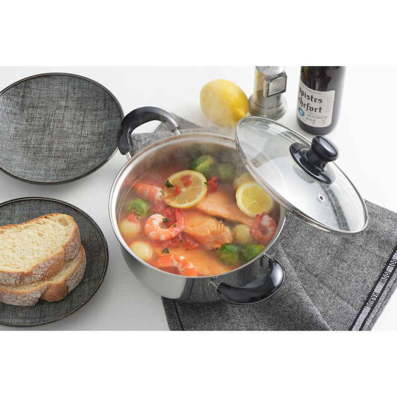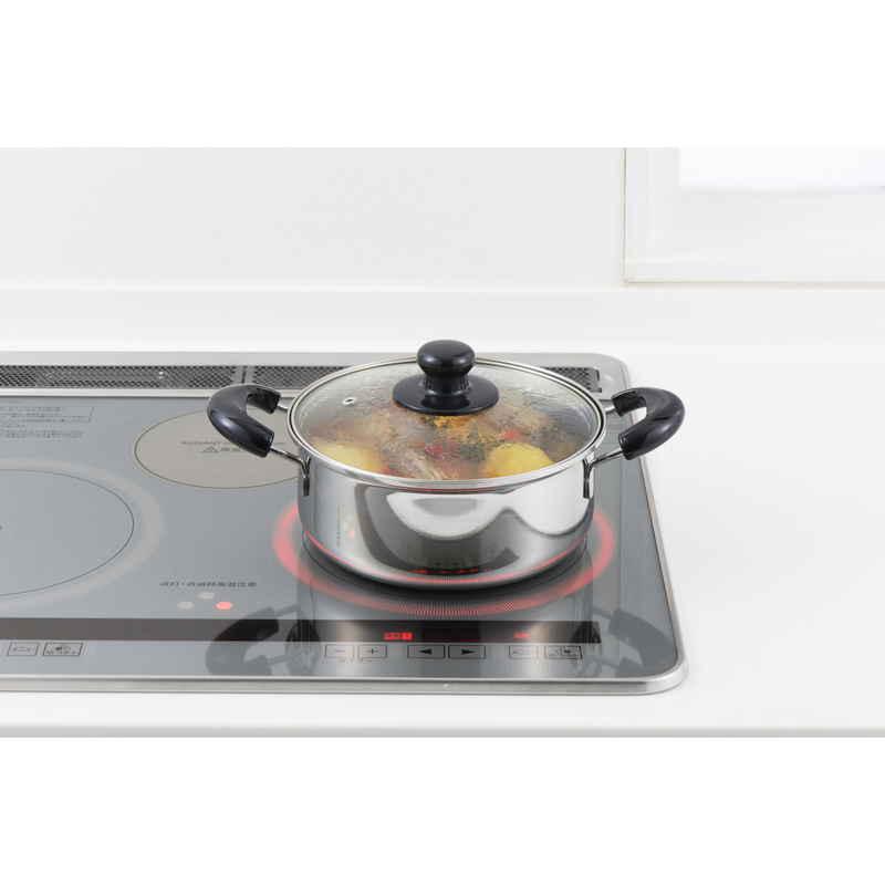 材質:本体/3層鋼(18-10ステンレス、鉄、18-10ステンレス) フタ/全面物理強化ガラス ハンドル・ツマミ/フェノール樹脂