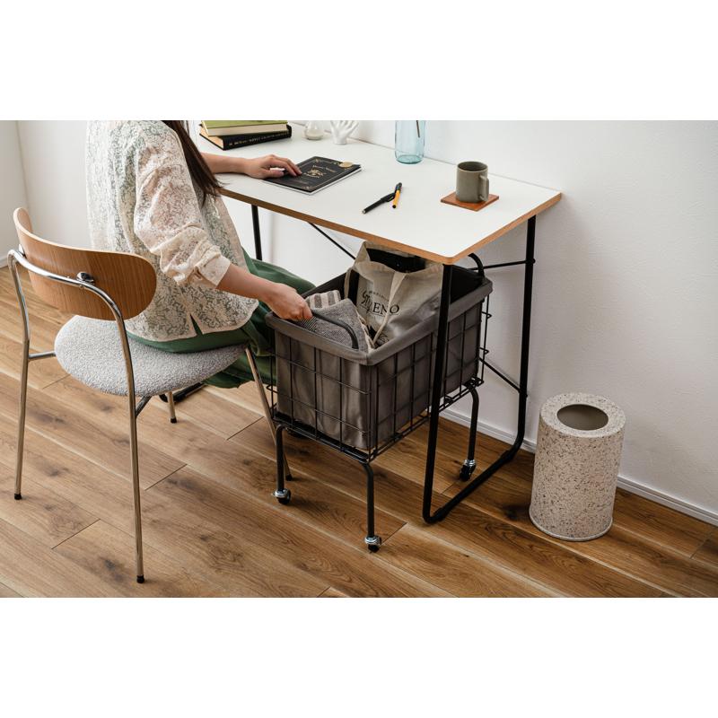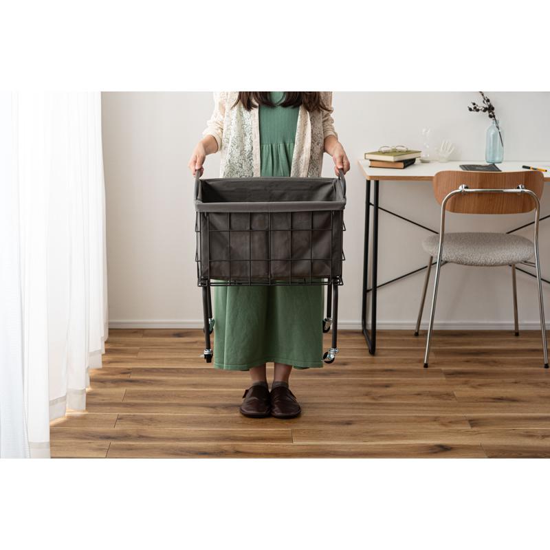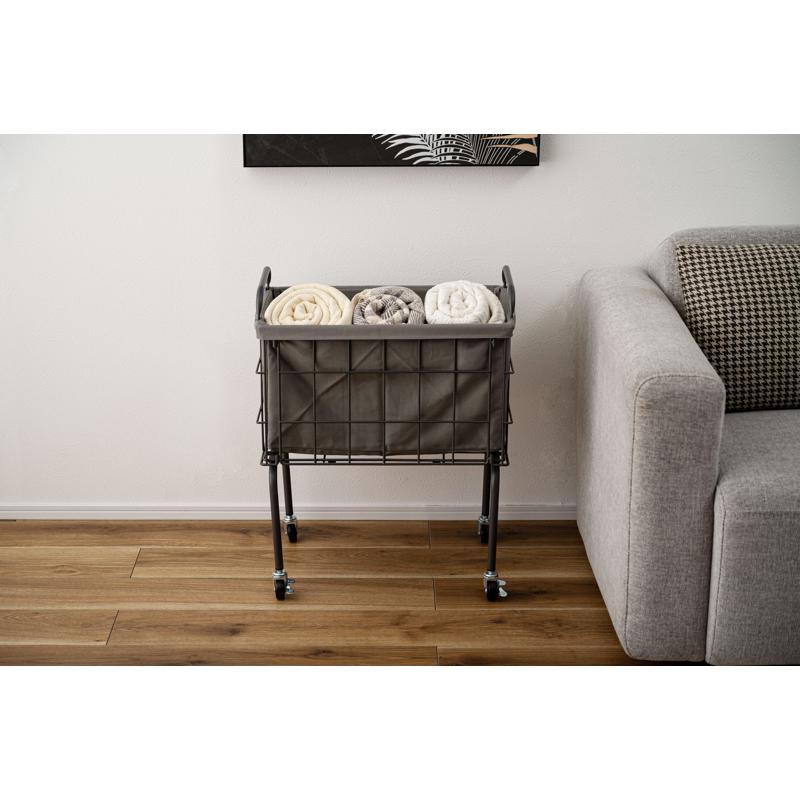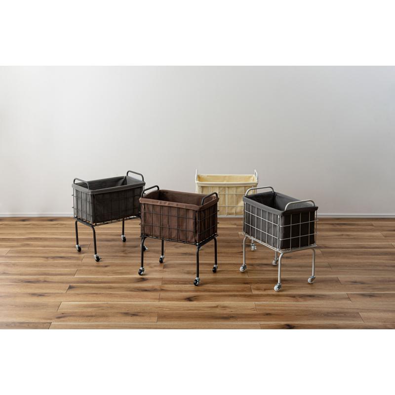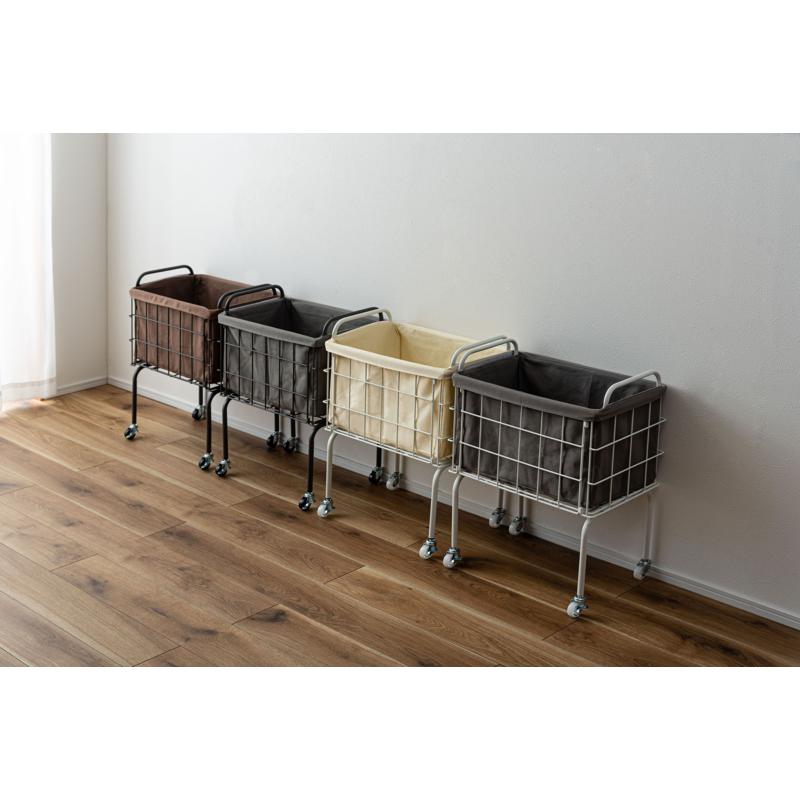 〇空間に合わせたスタイリッシュな収納 スタイリッシュなスチールとやさしいファブリックを組み合わせたバスケットワゴン
