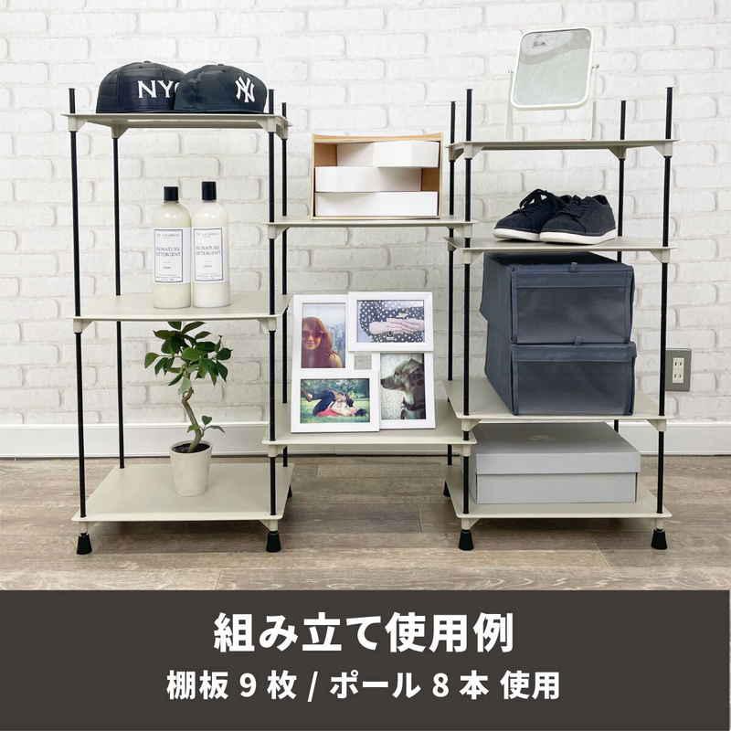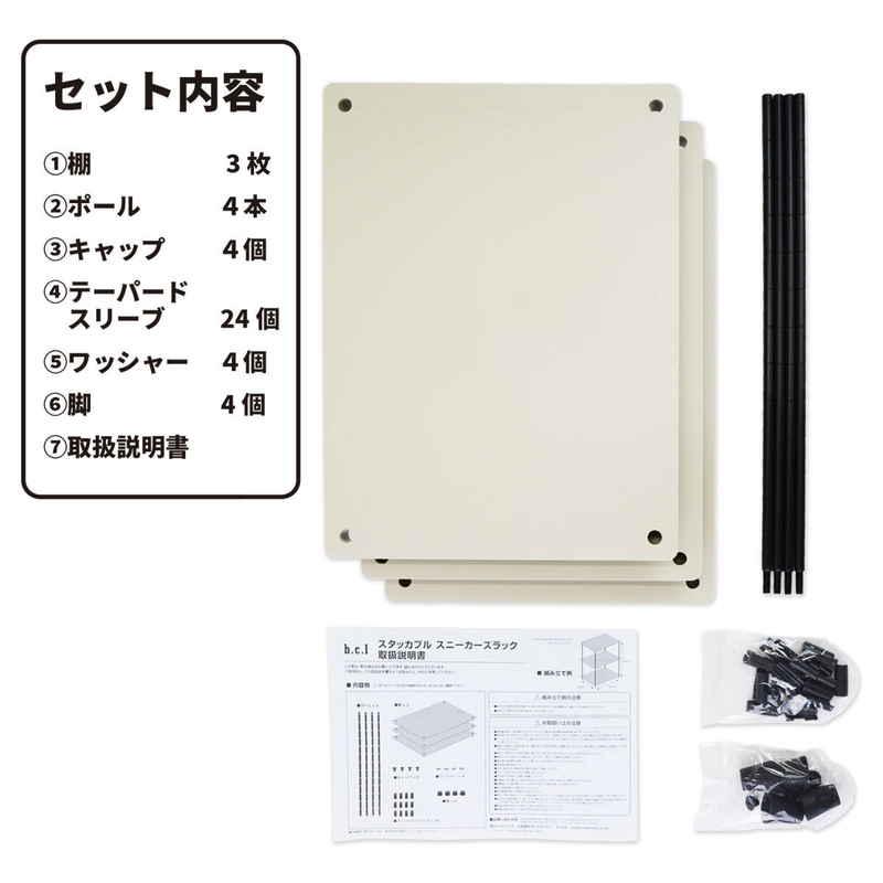 セット内容:ポール/4本 棚/3枚 テーパードスリーブ/24個(+予備2個) 脚/4個 キャップ/4個 ワッシャー/4個