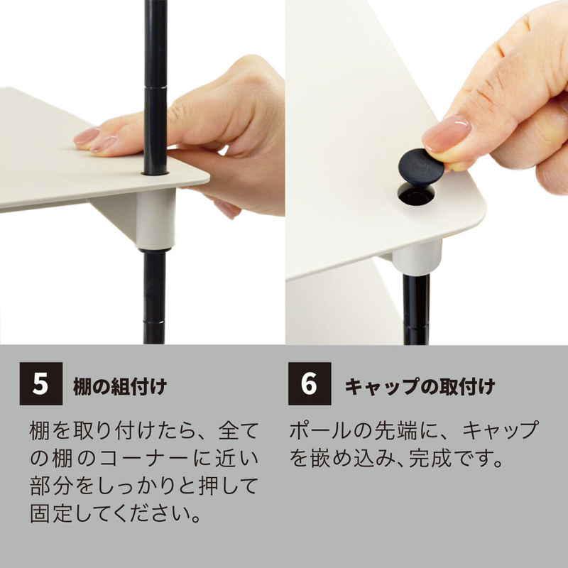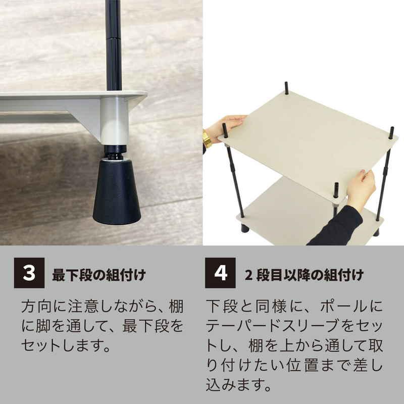 材質:棚/ハインパクトポリスチレン テーパードスリーブ/ABS樹脂 ポール、ワッシャー/メタル 脚、キャップ/ラバー