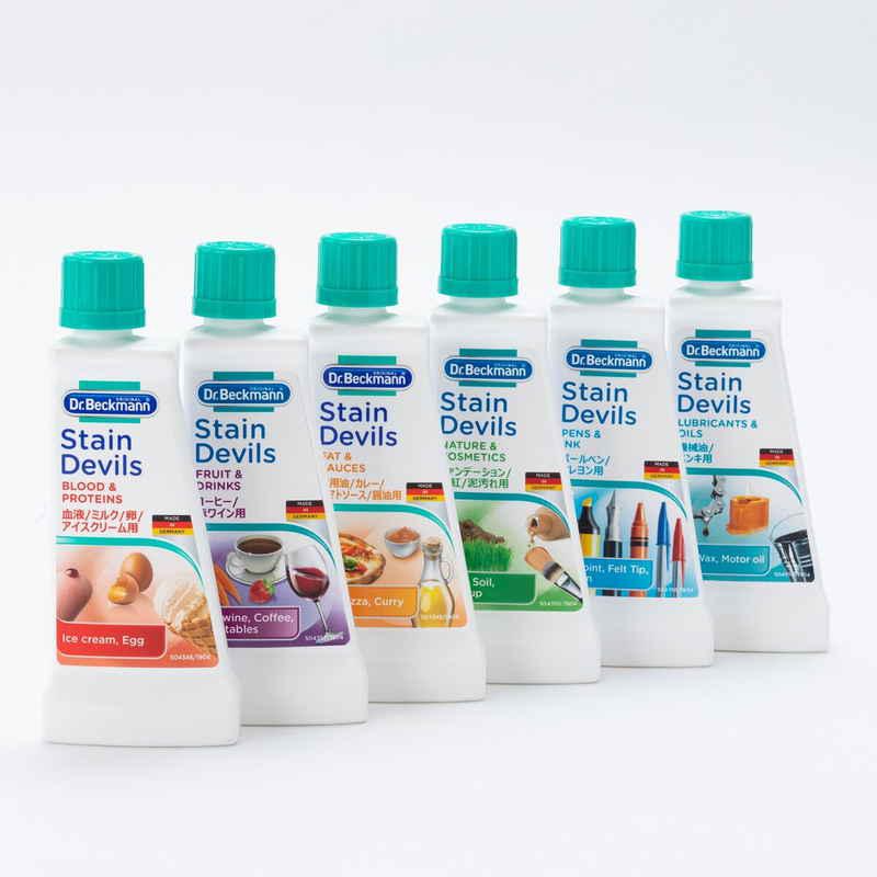 頑固なシミもしっかり落とせる 裏ラベルをめくって使い方を確認できる 安心のセーフティキャップ 頑固なシミにはお湯を使ってつけ置き洗い 一年前のシミもあきらめない! 原因別シミ取り剤「ステインデビルスシリーズ」
