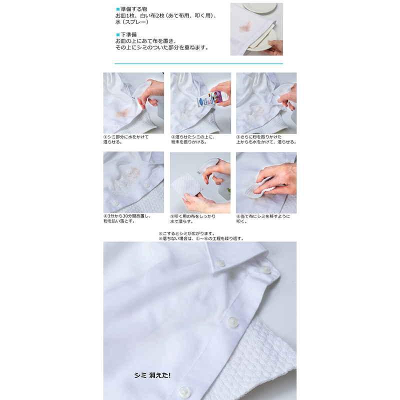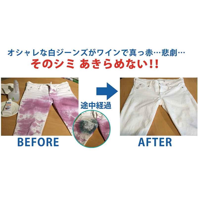 ブルーベリーなど)、炭酸飲料、野菜、ベビーフード、酢、白カビ、カビ、ニコチン、香水、ヨード、汗、尿、黄ばみ、鳥のフン ・使えない素材 和服、皮革製品(スウェードを含む)、アセテート、レーヨン、水で色落ちするもの、水で輪ジミになるもの