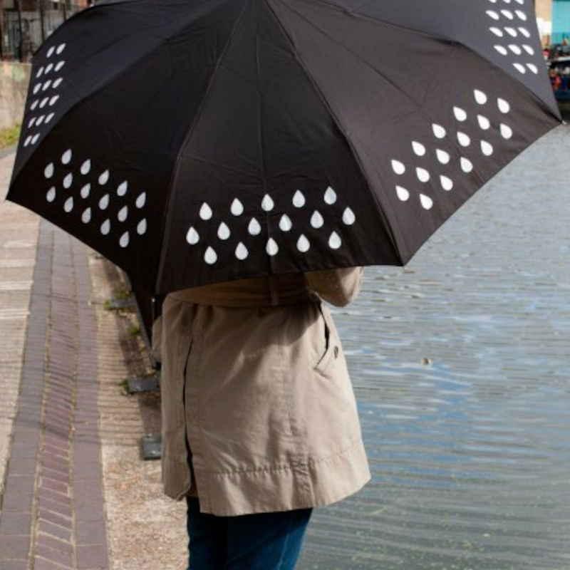 雨に濡れると白いプリントがカラフルに色づく不思議な傘です。