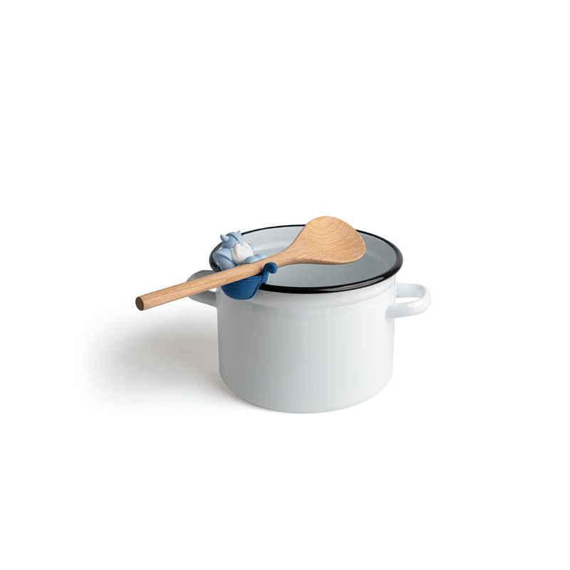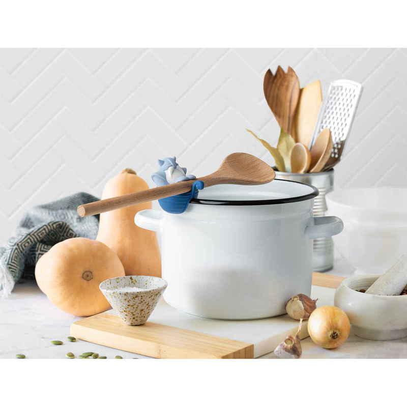 お鍋のフチに掛けておたまやヘラを持ってくれたり、お鍋のフタを少し開けたまま固定し、ふきこぼれを防止してくれるスプーンホルダー&スチームリリーサーです。