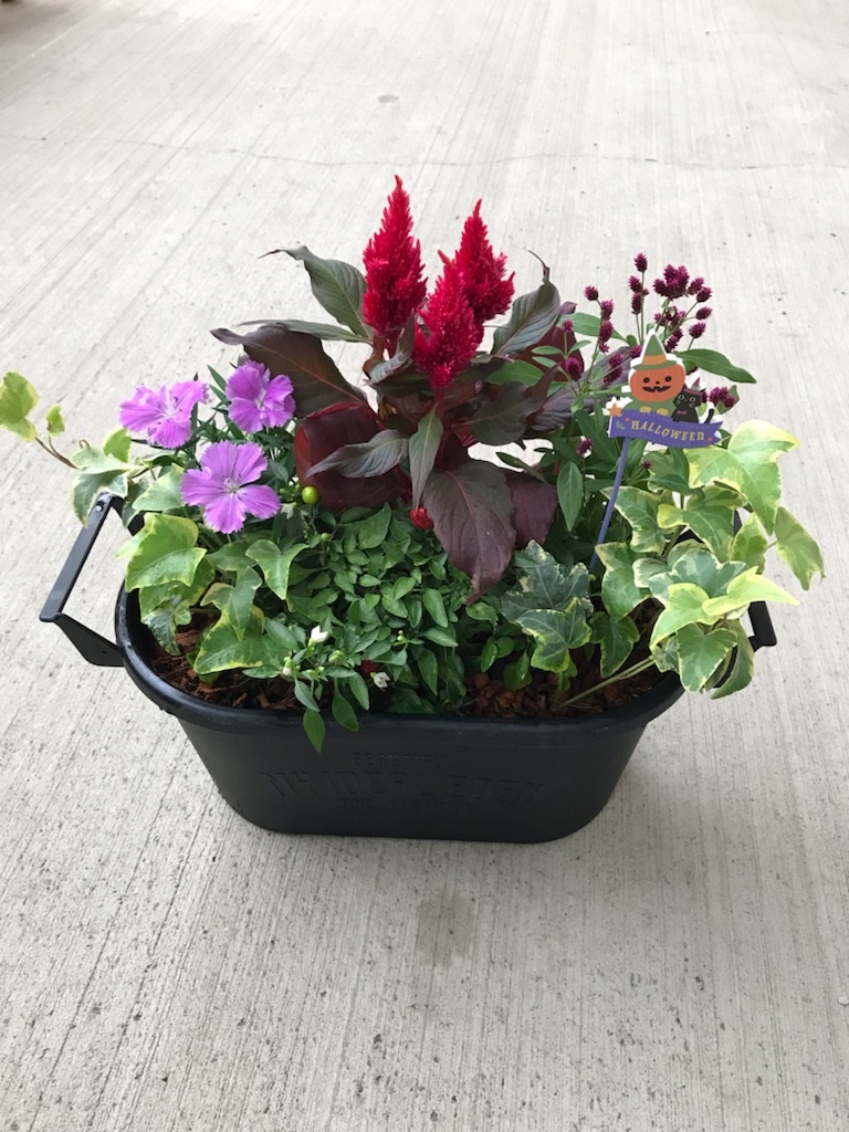 • <初心者歓迎♪>幅32×奥19㎝の鉢に季節の花を寄せ植えします!ハロウィンのピック付きです。