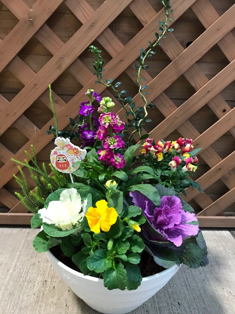 - お正月に向けた寄せ植えを作成します!お正月のピック付きです!※花の色、種類は変更になる場合があります。