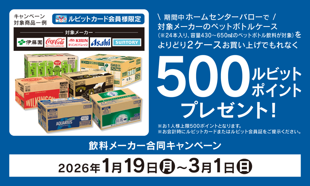 ◆ ルビットカード会員様限定 ◆ 2026年1月19日(月)~3月1日(日)の期間中にホームセンターバローで 対象メーカーのペットボトルケース飲料をよりどり2ケースお買い上げ頂... -