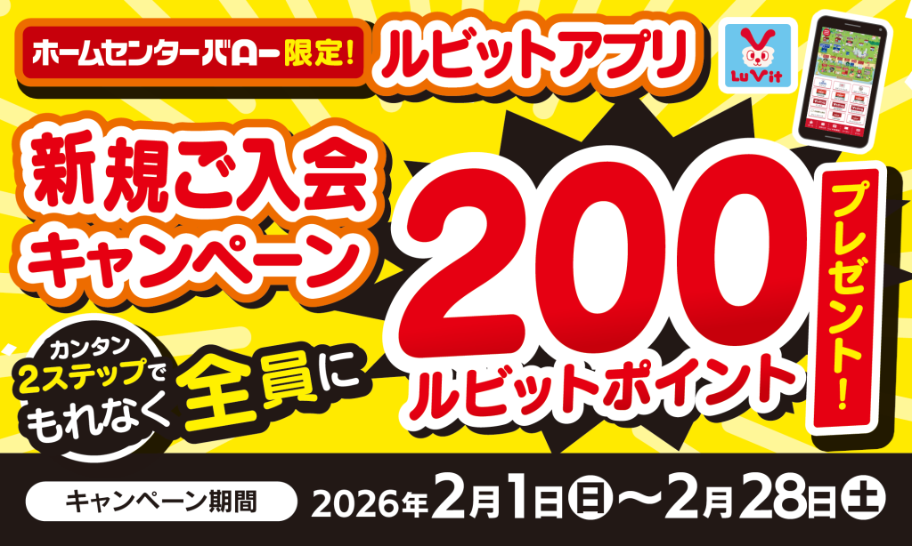 ◆ ルビットアプリ×ホームセンターバロー企画 ◆ 2026年2月1日(日)~2月28日(土)の期間中にカンタン2STEPの登録で もれなく全員に200ルビットポイントをプレゼント! キャ... -